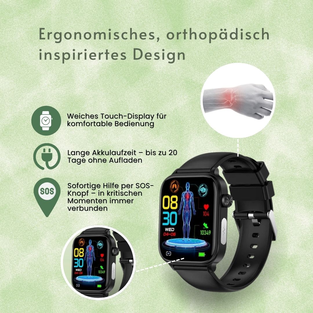 - Unkomplizierte Bedienung: Die SOS-Funktion unserer CARE SOS ist schnell und unkompliziert über das Hauptmenü der Uhr zu bedienen, selbst für Senioren mit begrenzten technischen Fähigkeiten.