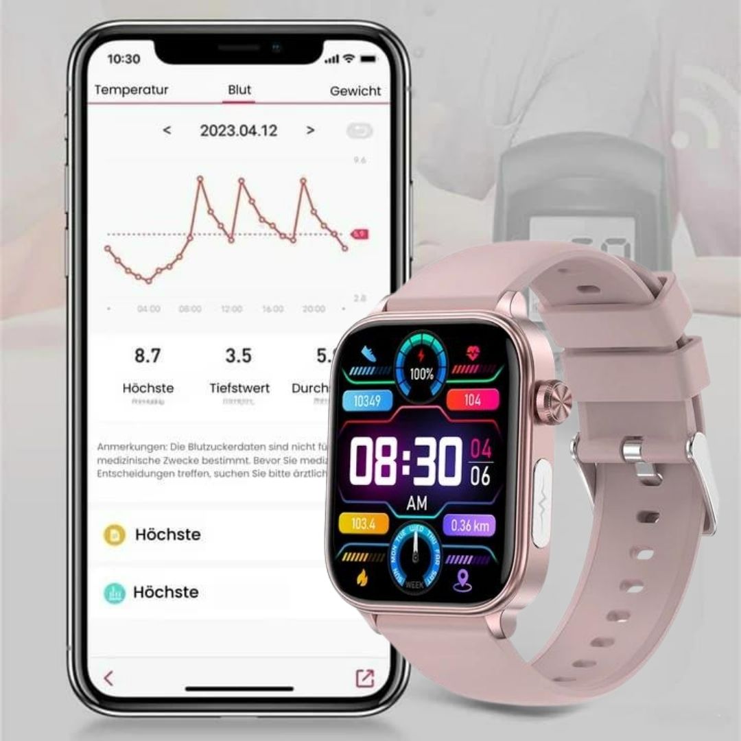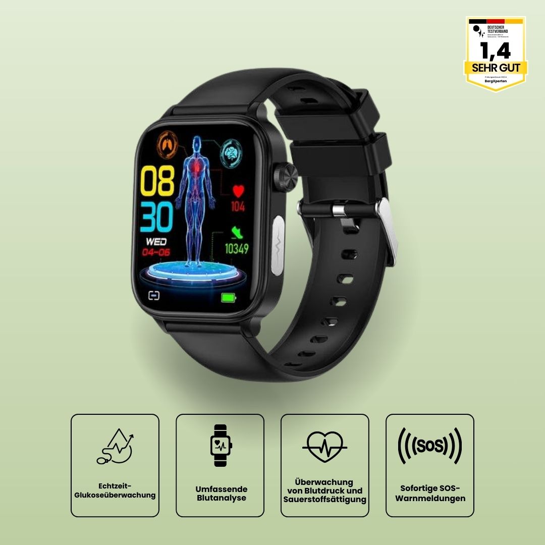 Entdecken Sie GlucoCare SOS, die Smartwatch, die mit ihren fortschrittlichen Überwachungsfunktionen, ihrer lebensrettenden SOS-Funktion und ihrem schlanken, eleganten Design Ihren Gesundheitsweg neu definiert.