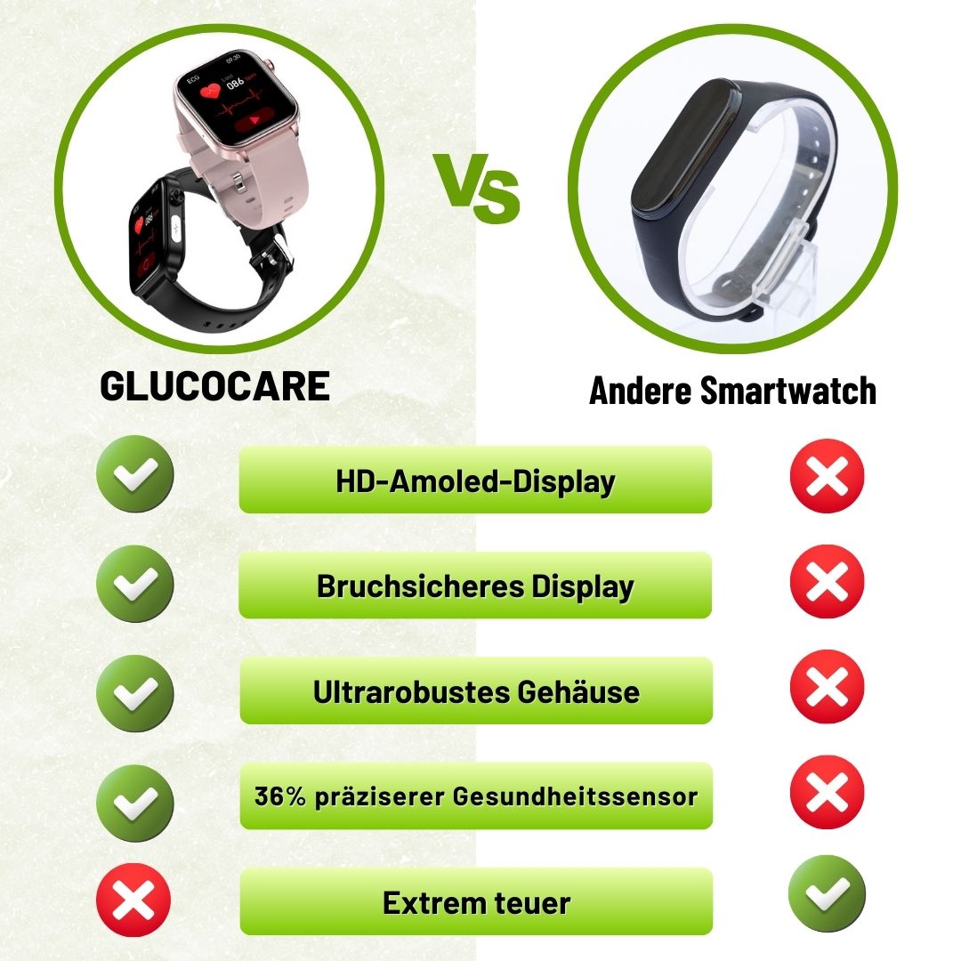 GlucoCare nutzt die fortschrittliche Chip-Sensortechnologie des Blutzuckermessgeräts, um Ihren Blutzucker in Echtzeit zu messen und wichtige Gesundheitskennzahlen mit einem Blick auf Ihr Handgelenk zu verfolgen.